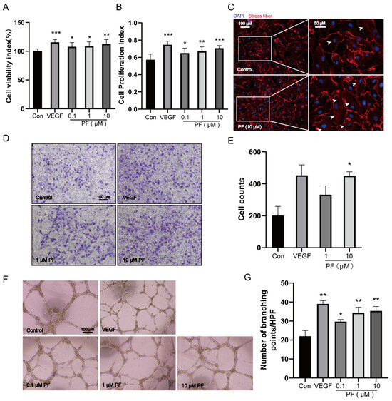 Endothelial cell proliferation and migration are essential for neovascularization [23]. To verify the consequence of PF on angiogenesis processes, we performed cell experiments, including angiogenesis assessments and vascular endothelial cell migration assays. Both PF and VEGF enhanced the viability and proliferation ability of HUVECs (Figure 4A,B). Additionally, the immunofluorescence analysis revealed that PF (10 μM) caused actin cytoskeleton rearrangement and the formation of actin stress fibers, which are crucial for endothelial cell migration (Figure 4C). We investigated the influence of PF on HUVEC migration through a Transwell assay, which showed a notable rise in the number of HUVECs traversing the chambers relative to the control group (Figure 4D,E). Notably, Matrigel tube formation assays demonstrated that both VEGF and PF (1, 10 μM) increased the number of vascular branch points and enhanced tube formation capacity of HUVECs compared to the control group (Figure 4F,G). These findings ascertained that PF promoted the proliferation, migration, and tube formation of HUVECs, suggesting its potential role in angiogenesis.