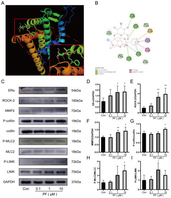 PF stimulated HUVECs’ migration and tube formation in HUVECs through the ERα/ROCK-2 pathway. (A,B) The diagram of the molecular docking structure and interaction of PF and ERα were performed. (C) The Western blot analysis of ERα, ROCK-2, P-LIMK, LIMK, P-cofilin, cofilin, P-MLC2, MLC2, and MMP2 protein expression in HUVECs treated with DMSO or PF (0.1, 1, and 10 μM) for 24 h. GAPDH acted as a loading control. (D–I) The quantification of protein levels of ERα, ROCK-2, and MMP2 to GAPDH and P-LIMK to LIMK, P-cofilin to cofilin, and P-MLC2 to MLC2 treated with DMSO or PF (0.1, 1 and 10 μM) in HUVECs for 24 h. The data points are represented as mean ± SD, n = 3. * p < 0.05, ** p < 0.01 vs. control.
