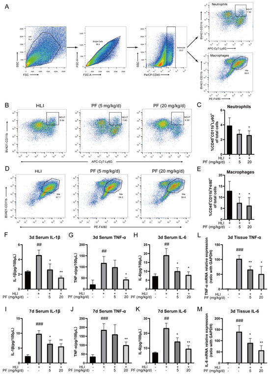 PF resolved inflammation during HLI. (A) The diagram of flow cytometric selection strategy of macrophages and neutrophils in HLI were shown. (B) Typical flow cytometry images of neutrophils in mice treated or not with PF (lower and high dose) on day 3 after surgery. Quantitative data were shown in (C) (n = 4–5). (D) Typical flow cytometry images of macrophages in mice treated or not with PF (lower and high dose) on day 3 after surgery. Quantitative data were shown in (E) (n = 4–5). (F–K) Serum concentrations of IL-1β, TNF-α, and IL-6 were quantified by an ELISA analysis on day 3 and day 7 after surgery (n = 3). (L–M) RT-PCR was utilized to examine TNF-α and IL-6 gene levels in ischemic gastrocnemius on day 3 following surgery (n = 4). The data points are represented as mean ± SD. ## p < 0.01, ### p < 0.001 vs. sham; * p < 0.05, ** p < 0.01 vs. HLI.
