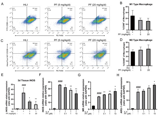 PF regulated the phenotypic transformation of macrophages in vivo and in vitro experiments. (A,C) Typical flow cytometry images of pro-inflammatory and anti-inflammatory macrophages in mice treated or not with PF (lower and high dose) on day 3 after surgery. Quantitative data were shown in (B,D) (n = 4–5). (E) Expression levels of iNOS mRNA were analyzed in ischemic gastrocnemius by an RT-PCR analysis on day 3 after surgery (n = 4). (F) Quantitative data of pro-inflammatory macrophages markers iNOS mRNA expression in BMDMs treated with DMSO or PF (0.1, 1, and 10 μM) for 24 h were evaluated using RT-PCR (n = 3). (G,H) Quantitative data of anti-inflammatory macrophages markers MR and ARG-1 mRNA expression in BMDMs exposed to DMSO or PF (0.1, 1, and 10 μM) for 24 h were evaluated using RT-PCR (n = 3). The data points are represented as mean ± SD. ### p < 0.001 vs. sham; * p < 0.05, ** p < 0.01 vs. HLI.