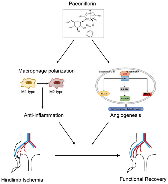 Background: Peripheral artery disease (PAD) is a high-risk vascular condition, and vascular remodeling has become a promising therapeutic approach. Paeoniflorin (PF) is the main bioactive compound in the roots of Paeonia lactiflora Pall, which is commonly used to treat a range of cardiovascular disorders. However, the mechanisms underlying the ameliorating effects of PF on PAD remain unclear. Therefore, the purpose of this study was to explore the therapeutic efficiency of PF on PAD and determine its mechanisms. Methods: The blood flow of mice was detected with a laser Doppler dot scanning imaging system. HE staining was used to observe the morphological changes of ischemic muscle. The changes in the serologic indexes were detected with an automatic biochemical assay, and the capillary density of ischemic gastrocnemius was detected with a Lectin immunofluorescence assay. The expression of angiogenesis-related proteins in ischemic gastrocnemius was detected with Western blotting, and the proportion of macrophages and neutrophils in total cells was detected with flow cytometry. Results: PF significantly increased blood flow, capillary density and protein expressions of vascular endothelial growth factor A (VEGFA), matrix metalloproteinase 2 (MMP2), matrix metalloproteinase 2 (MMP9), and estrogen receptor α (ERα) in mouse ischemic tissue in a PAD model. PF enhances the migration of endothelial cells and promotes the formation of tubular structures, involving the ERα/ROCK2 signaling pathway. Furthermore, PF was found to promote the phenotypic transformation of macrophages and alleviated grave inflammatory responses during vascular remodeling. Conclusions: We determined that PF as a potent compound in promoting angiogenesis and mitigating inflammatory responses during revascularization.