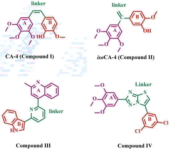 Tubulin has been identified as an important therapeutic target for cancer treatment due to its role in cell division, signaling, protein transport, and cellular structure maintenance [9,10,11]. Researchers have investigated numerous tubulin inhibitors with various scaffolds, most notably combretastatin A-4 [CA-4 (I), Figure 1], a prominent tubulin polymerization inhibitor that binds to the colchicine site in tubulin and effectively suppresses cancer cell proliferation at low nanomolar concentrations [12,13]. However, the isomerization of the cis-double bond to a more stable and inactive trans-form hindered its potential therapeutic application [14,15,16]. Consequently, there is growing interest in developing innovative tubulin inhibitors for cancer treatment.