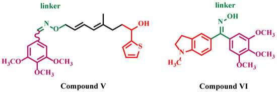 Oximes are hydroxy-imine derivatives popular in medicinal chemistry because they are simple to synthesize from carbonyl compounds and have diverse biological effects [29,30,31]. Concerning tubulin-binding oximes, the curacin A oxime analog V (Figure 2) blocks tubulin polymerization like CA-4, with the oxime group acting as a bioisosteric substitute for a (Z)-alkene group [32]. Moreover, diaryl methyl oxime VI (Figure 2), which has an indole ring, has demonstrated significant inhibitory effects on tubulin polymerization [33].