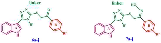 Inspired by previous findings of indole and/or 1,2,4-triazole derivatives as tubulin polymerization inhibitors and in continuation of our efforts to develop novel antitumor agents [34,35,36,37,38], we aim to combine these two moieties into a unique molecular framework to develop a novel series of indole-triazole hybrids 6a–j and 7a–j (Figure 3). The new compounds comprise the three main parts of CA-4: ring A, which is an indole ring; ring B, which is a substituted phenyl group; and the linker, which is the 1,2,4-triazole moiety. We employed oxime formation (7a–j) to enhance the efficacy of 6a–j analogs. This mechanism could either augment chemotherapeutic activity through nitric oxide release or enhance binding to the colchicine binding site via hydrogen bond formation. This study presents comprehensive synthesis pathways, antiproliferative properties, and tubulin polymerization inhibitory effects.