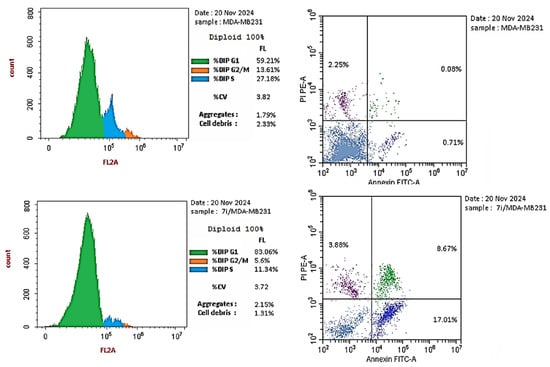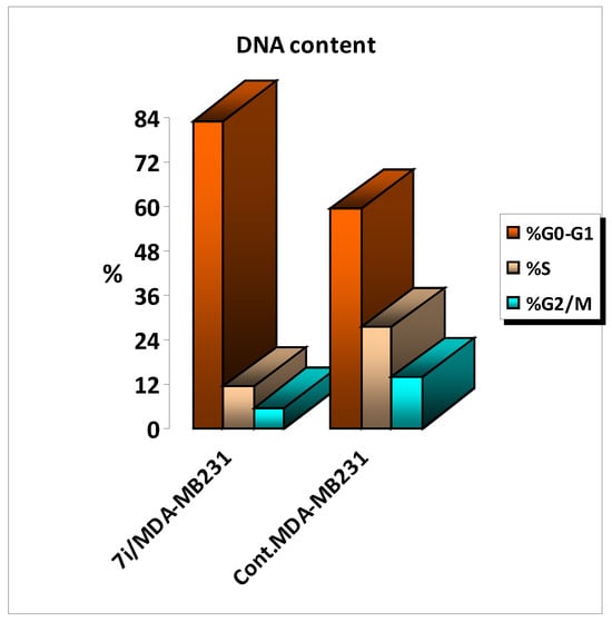 The impact of compound 7i on cell cycle progression was investigated in MDA-MB 231 breast cancer cells. The breast cancer (MDA-MB 231) cell line was treated for 24 h with an IC50 concentration of 7i. The cell line was handled with PI/Annexin V, and flow cytometry was utilizing a BD FACS Caliber [47]. The results (Figure 4) indicated that MDA-MB 231 cells subjected to compound 7i exhibited a substantial accumulation of 83% in the G0/G1 phase following 24 h of incubation. This indicates a cell cycle arrest at the G1 phase transition.
