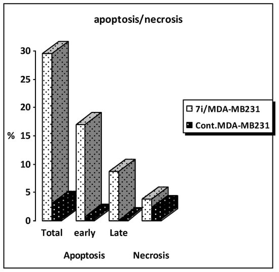 The MDA-MB 231 cell was labeled with Annexin V/PI, cultured for 24 h, and examined to assess the capacity of 7i to induce apoptosis. Examining early and late apoptosis demonstrated that compound 7i elicited substantial apoptosis, accompanied by a necrosis rate 3.88 (Figure 5 and Figure 6).