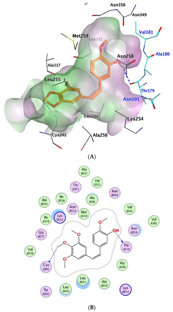 Ligplots at α/β-tubulin colchicine binding site: (A) 3D-docked model of CA-4 (dark yellow) showing the protein lipophilicity surface (purple: hydrophilic, white: neutral, and green: lipophilic), (cyan for α chain residues and brown for β chain residues), and (B) 2D-docked model of CA-4.