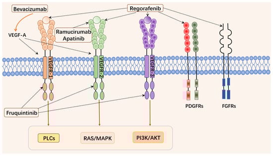 Among VEGFR family members (VEGFR-1, 2, and 3), VEGFR-1 (also known as Flt-1) plays a relatively weak role in signaling due to its low tyrosine kinase activity [17]. In contrast, VEGFR-2 (also known as KDR/Flk-1) primarily mediates VEGF signaling and has higher tyrosine kinase activity, which drives various functions of vascular endothelial cells [18]. When VEGF binds to VEGFR-2, it activates a variety of downstream signaling pathways, including RAS/MAPK, PI3K/AKT, and PLCγ, thereby promoting angiogenesis and tumor progression [19]. VEGFR-3 (Flt-4) is primarily involved in lymphangiogenesis [20], with VEGF-C and VEGF-D as main ligands, which plays a crucial role in regulating lymphatic endothelial cell functions and has become a significant focus of research in cancer studies [15].