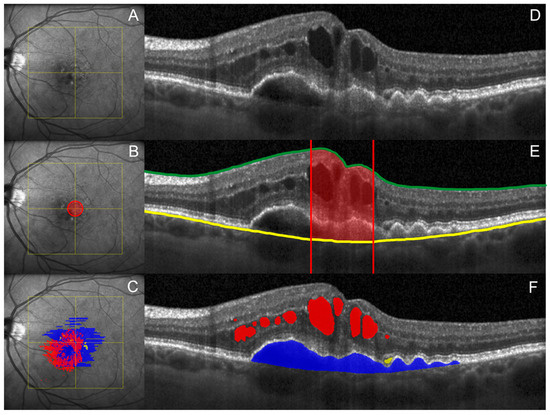 En face near-infrared reflectance image (A–C) and central B-scan (D–F). (B,E): Schematic illustration of CST, the mean thickness in the central 1 mm diameter of the ETDRS-grid (red) between the internal limiting membrane (green) and the Bruch’s membrane (yellow). (C,F): Example of automated segmentation of IRF (red), SRF (yellow) and PED (blue) using the Fluid Monitor (Version 2.5, RetInSight, Vienna, Austria). ETDRS = Early Treatment Diabetic Retinopathy Study, CST = central subfield thickness, IRF = intraretinal fluid, SRF = subretinal fluid, and PED = pigment epithelium detachment.