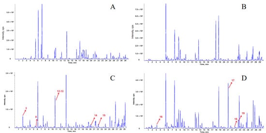 Total ion chromatograms (TIC) of serum samples based on UPLC-Q-TOF/MS. TIC of blank serum samples in ESI- mode (A), TIC of blank serum samples in ESI+ mode (B), TIC of LPT drug-containing serum samples in ESI- mode (C), and TIC of LPT drug-containing serum samples in ESI+ mode (D).
