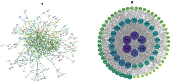 Network diagram of PPI proteins (A), and interaction network of key target (B).