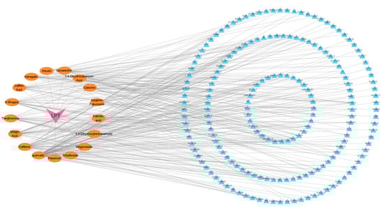 A ‘compound–target’ network was constructed using Cytoscape 3.9.1 to elucidate the interactions between the active compounds of LPT and the 298 intersection targets associated with gastrointestinal motility disorder (Figure 4). In this network, orange circular nodes represent the active compounds of LPT, pink triangular nodes indicate LPT itself, and blue triangular nodes denote disease-related intersection targets. The network reveals that LPT exerts its therapeutic effects through multiple components acting on various targets. Among these compounds, quercetin, caffeine, and ellagic acid interact with the greatest number of targets, suggesting that they may play a key role in the therapeutic effects of LPT.
