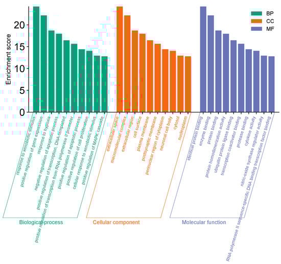 A total of 298 potential targets were imported into the DAVID and Metascape databases for functional enrichment analysis based on the Gene Ontology (GO) database (http://geneontology.org/, accessed on 16 April 2024). A significance threshold of p ≤ 0.01 was applied for the selection of 374 biological process (BP) entries, 52 cellular component (CC) entries, and 74 molecular function (MF) entries. The BP, CC, and MF entries are presented in descending order of count values (Figure 5). The results indicate that the primary mechanisms through which LPT affects GMD include responses to xenobiotic stimuli, positive regulation of gene expression, and negative regulation of the apoptotic process.
