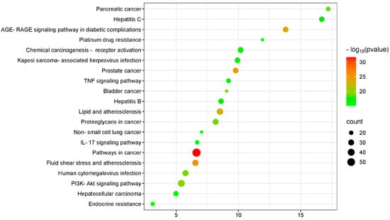 In the KEGG pathway enrichment analysis, a significance threshold of p < 0.01 was applied, identifying 137 signaling pathways. The top 20 pathways were visualized in a scatter plot (Figure 6). The results reveal that the potential target pathways are involved in several biologically relevant processes, with pathways related to malignancy and inflammation showing the strongest associations. Among the inflammation-related pathways, the “TNF signaling pathway”, “PI3K-Akt signaling pathway” and “Interleukin-17 signaling pathway” were the most enriched.