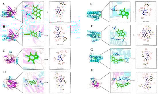 Visual analysis of molecular docking. AKT1-ellagic acid (A); AKT1-quercetin (B); TP53-caffeine (C); TP53-ellagic acid (D); IL-6-caffeine (E); IL-6-ellagic acid (F); IL-6-quercetin (G); TP53-quercetin (H).