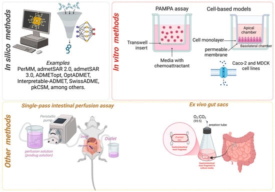 The determination of permeability for prodrugs can be assessed through several methods, which includes in silico, in vitro, cell based, in situ perfusion, ex vivo gut sacs, and ex vivo diffusion chambers (Figure 1). In this context, the general principles of these methods and their application to evaluate prodrug permeability is described below.