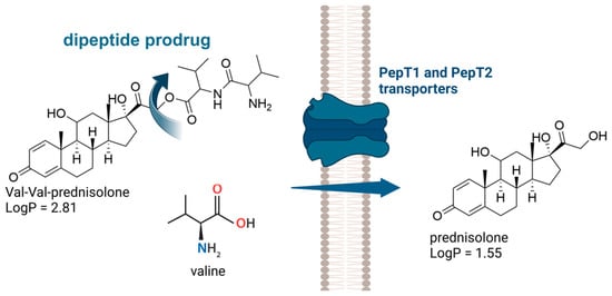 For example, Shen and colleagues synthesized dipeptide prodrugs of prednisone for ocular use, aiming to increase water solubility, enhance permeability, and reduce efflux by P-gp. The authors targeted the PepT1 and PepT2 transport systems, utilizing the valine–valine (Val-Val) sequence conjugated to prednisone and valine (Val) conjugated to prednisone to avoid P-gp-mediated efflux. It was demonstrated that the solubility of the Val–prednisone (4.24 mg/mL) and Val-Val–prednisone (3.11 mg/mL) prodrugs was significantly higher than that of the parental drug prednisone (0.31 mg/mL), while also exhibiting good chemical stability. The dipeptide prodrug (Val-Val–prednisone) (Figure 2) showed a half-life of 27 h at pH 7.4 and did not exhibit cytotoxic effects in MDCK cells at concentrations ranging from 5 to 250 μM. Unlike the parent corticosteroid, the Val-Val dipeptide prodrug was not a substrate for P-gp and was recognized by the peptide transport system in MDCK cells [82]. A similar strategy involving dipeptides to enhance drug permeability was described for several drugs, including acyclovir [83], lopinavir [84], and decitabine [85].