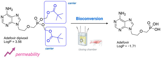 The everted gut sac model is another experimental approach for evaluating permeability, in which a section of the intestine, removed from an experimental animal, is everted over a tube. In this model, intestinal sacs of up to 4 cm are tied and immersed in a buffer solution containing the test substance. The concentration of the test compound is then measured using analytical methods [94,95,96,97]. The ex vivo diffusion chamber method involves extracting a segment of the intestine from an animal and placing it into a chamber containing donor and acceptor solutions. This method can also be used to evaluate the permeability of prodrugs [98]. Such a method was used to evaluate the permeability of phenytoin prodrugs by using excised porcine nasal mucosa assembled in an Ussing chamber [99]. Several experiments using ex vivo diffusion chamber methods have been reported elsewhere, highlighting their application [15,100,101]. Annaert and colleagues (2000) reported that the adefovir dipivoxil prodrug (Figure 3) exhibited an 100-fold increase in permeability by using in vitro models. This significant increase in permeability is the result of the functionalization of hydroxyls to form the methyl pivalate ester, which acts as a plasma carrier (Figure 3). However, the authors did not find the same correlation when using Ussing chambers, which highlights the importance of combining different permeability methods to characterize the effects of prodrugs [102].