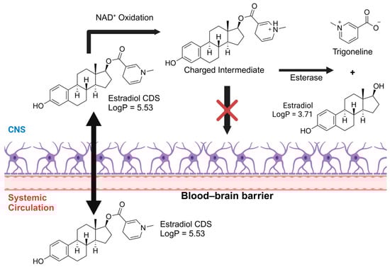 To improve BBB permeability, a more elaborate prodrug approach is needed, as is the case of Chemical Delivery Systems (CDSs), a prodrug approach with multiple bioactivating steps. Such an approach was employed for an estradiol CDS prodrug consisting of a dihydrotrigonelline moiety esterified to an estradiol molecule (Figure 4) [169]. The CDS would benefit from increased lipophilicity (logP 4.5) from the esterification and cross the BBB, followed by oxidation of the dihydrotrigonelline moiety to trigonelline, which is positively charged. Once the CDS acquires a charge, its lipophilicity dramatically decreases (logP −0.17), making it unable to cross the BBB again and getting trapped inside the CNS, where it lingers long enough to be slowly hydrolyzed, releasing estradiol locally [169,170]. Unfortunately, this CDS, known as Estredox or IDR-90104, had its phase II clinical trials discontinued [171].