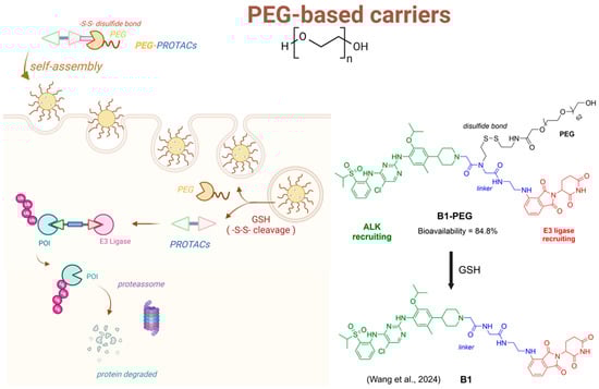 Wang and colleagues (2024) explored a novel strategy to enhance the permeability of PROTACs by designing an amphiphilic PROTAC incorporating a long-chain polyethylene glycol (PEG) linked to a disulfide bond, which acts as a glutathione-responsive subunit, allowing for selective cleavage inside tumor cells. The authors focused on degrading the echinoderm microtubule-associated protein-like 4-anaplastic lymphoma kinase (EML4-ALK), a protein implicated in several cancers, including non-small cell lung cancer (NSCLC). By using this protein as the target, they employed ceritinib as the ligand and pomalidomide for cereblon (CRBN) recognition by the E3 ligase. PEG was chosen as the linker due to its hydrophilic properties, and the amphiphilic nature of the PROTAC led the authors to hypothesize that the pro-PROTAC could self-assemble into micelles in aqueous environments, significantly improving its solubility. Given the high glutathione levels in tumor cells, the disulfide bond would be reduced and cleaved, facilitating PROTAC release within tumor cells. The authors demonstrated the antiproliferative effects of the PROTAC through ALK degradation. In vivo, the pro-PROTAC B1-PEG exhibited an impressive absolute bioavailability of 84.8%, compared to 63.5% for the conventional PROTAC. Moreover, studies using the H3122 xenograft mouse model demonstrated the superior efficacy of the pro-PROTAC over both the conventional PROTAC and ceritinib, highlighting the enhanced physicochemical properties and cell permeability of the pro-PROTAC (Figure 6) [206].