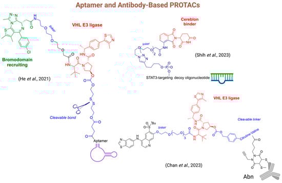 - He, S.; Gao, F.; Ma, J.; Ma, H.; Dong, G.; Sheng, C. Aptamer-PROTAC Conjugates (APCs) for Tumor-Specific Targeting in Breast Cancer. Angew. Chem. Int. Ed. Engl. 2021, 60, 23299–23305. [Google Scholar] [CrossRef]