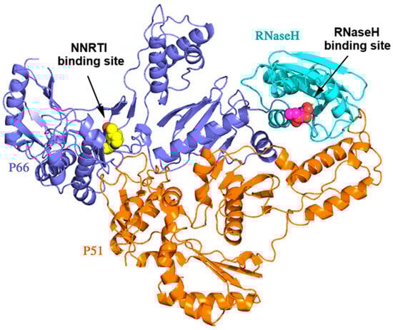 Reverse transcriptase (RT) is a multifunctional heterodimeric enzyme characterized by the subunits of 66 and 51 kDa (p66/p51) consisting of three distinct catalytic activities. The first one is the RNA-dependent DNA-polymerase (RDDP) activity where the pro-viral DNA is produced from the viral RNA. The second catalytic activity is the cleavage of the RNA portion of the RNA/DNA hybrid by the ribonuclease H (RNase H), and the last activity involved the DNA-dependent DNA-polymerase (DDDP) activity responsible for the DNA synthesis [4].