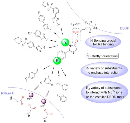 - The presence of a benzyl group at position 2 of the thiazolidinone moiety helps the molecule to obtain the “butterfly” configuration required to bind to the allosteric center of NNRTIs and inhibit RT.