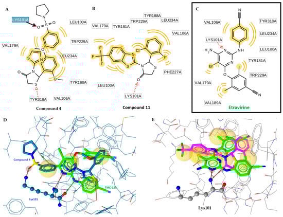 (A) A 2D interaction diagram of compound 4 docking pose. (B) A 2D interaction diagram of compound 11 docking pose. (C) A 2D interaction diagram of Etravirine inhibitor docking pose. (D) Superposition of compound 4 (blue) and Etravirine (green). (E) Superposition of compound 11 (magenta) and Etravirine (green) in active site of RT-HIV. Red dotted arrows indicate H-bonds and yellow spheres hydrophobic interactions.