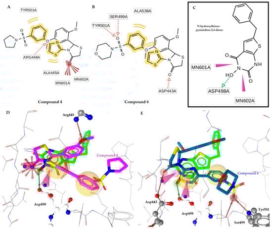 (A) A 2D interaction diagram of compound 4 docking pose. (B) A 2D interaction diagram of compound 6 docking pose. (C) A 2D interaction diagram of N-hydroxythieno-pyrimidine-2,4-dione inhibitor docking pose. (D) Superposition of compound 4 (pink) and N-hydroxythieno-pyrimidine-2,4-dione inhibitor (green) in active site of RT RNase H. (E) Superposition of compound 6 (blue) and N-hydroxythieno-pyrimidine-2,4-dione inhibitor (green) in active site of RT RNase HActive site. Hydrogen bonds are shown as red and green dotted arrows, hydrophobic interactions as yellow spheres, and Mg2+ ions as blue spheres.