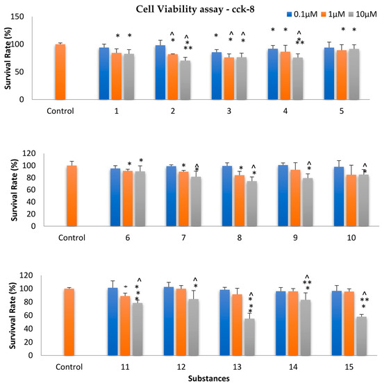 Survival rate (%) of MRC-5 cells exposed for 24 h under various concentrations of the substances. All values are presented as mean ± standard deviation (SD) of triplicate incubations. This with * represent the significant differences between each concentration and the control group. The symbol ^ represents the statistically significant difference between each concentration examined and the 0.1 µM for each compound. Similarly, the symbol ** represents the statistically significant difference in the higher concentration (10 μM) with the intermediate concentration (1 μM). The statistical tests used for this analysis were one way ANOVA and t-tests, with a significance level of p < 0.05.