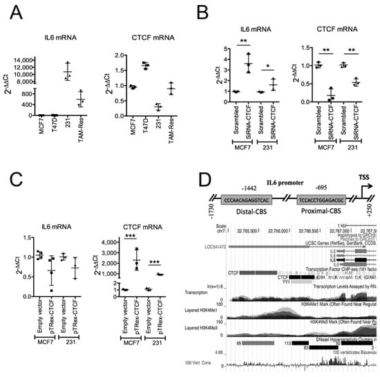 2.1. CTCF Inhibits IL6 Gene Transcription in BC Cell Lines