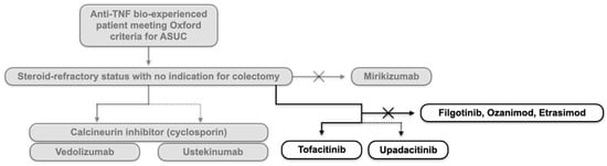 - Komeda, Y.; Kono, M.; Kashida, H.; Tribonias, G.; Masaki, S.; Takada, R.; Nagai, T.; Hagiwara, S.; Nishida, N.; Takenaka, M.; et al. Successful Initial Tofacitinib Treatment for Acute Severe Ulcerative Colitis with Steroid Resistance: A Case Series. Ann. Gastroenterol. 2023, 36, 97–102. [Google Scholar] [CrossRef] [PubMed]