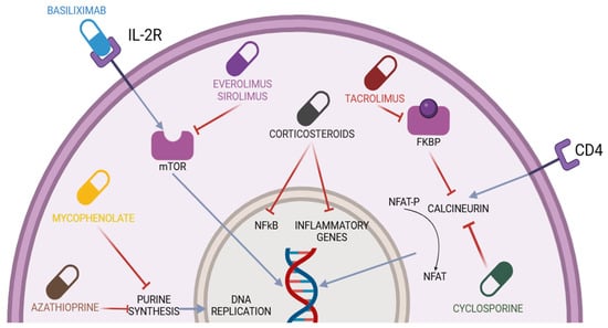 This section will address the mechanisms of action of the main immunosuppressive drugs used in LT. The immunosuppressive drugs typically used in LT belong to the class of calcineurin inhibitors (CNIs), including cyclosporine (CsA) and tacrolimus (TAC), corticosteroids (primarily prednisone), antimetabolite drugs (mycophenolate mofetil (MMF) and azathioprine (AZA)), inhibitors of the mammalian target of rapamycin (mTOR-I, everolimus (EVR), and sirolimus (SRL)), and biologic agents (basiliximab). Figure 1 shows the various molecules used in the context of post-LT immunosuppression and their respective mechanisms of action.