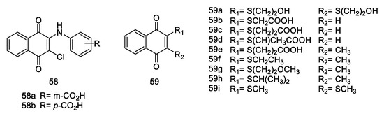 The study by Kirpotina et al. [77] ventures into the realm of cellular signaling, explicitly targeting the cell division cycle 25 (Cdc25) and Mitogen-Activated Protein Kinase Kinase 7 (MKK7), both intimately linked to tumor development. The authors explored this by introducing a phenylamino side chain at the 2-position of the naphthoquinone ring, resulting in two structurally similar compounds, 58 and 59 (Figure 6). Their investigation further expanded to a series of naphthoquinone compounds (59a–i) with diverse substituent groups, evaluating their anticancer activities against nine tumor cell lines, inhibitory effects on MKK7 and MKK4, as well as Cdc25 A/B, complemented by molecular docking studies.