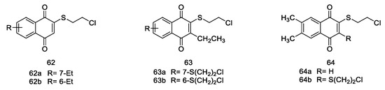Dyshlovoy and Pelageev et al. [80] approached naphthoquinone synthesis by introducing a 2-chloroethylthio group onto the naphthoquinone moiety. They tested the resulting compounds against advanced prostate cancer cell lines, uncovering that 62, 63, and 64 (Figure 8) exhibited potent inhibitory effects. Derivatives 62 and 64a, in particular, showed remarkable activity and selectivity, with IC50 values ranging from 0.14 μM to 0.77 μM. The study provides valuable insights into the structural determinants of cytotoxicity, indicating that introducing the 2-chloroethylthio group enhances the compounds’ anticancer potential. Moreover, the research demonstrated that 62 and 64b exert their anticancer effects primarily through the induction of DNA damage and cysteinase-dependent apoptosis, offering a novel therapeutic mechanism against prostate cancer.