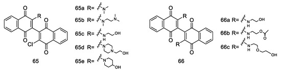 Ferraris et al. [81] explored a unique approach by dimerizing amino alcohol-substituted naphthoquinone compounds. Their investigation focused on the compounds’ anticancer activities against Acute Myeloid Leukemia cell lines, including MOLM-14 and MV4-11. The study highlighted 65a-e presenting a remarkable anticancer activity (Figure 9), along with 65d, 66a, and 66b exhibiting pronounced cytotoxic effects. The findings also revealed that 66a and 66b inhibited Indoleamine 2,3-dioxygenases (IDO), suggesting a mechanism that disrupts cancer cell proliferation, a significant advance in understanding the molecular pathways of these compounds.