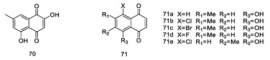 - Singh, H.; Folk, T.L.; Scheuer, P.J. Synthesis of juglone derivatives: Hydroxy, acetyl and ethyl substituents. Tetrahedron 1969, 25, 5301–5310. [Google Scholar] [CrossRef]