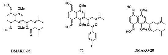 Shikonin is a naturally occurring compound capable of excreting profound antitumor, antitelomerase, and antiangiogenesis effects and is also responsible for DNA topoisomerase I/II inhibition [82,83]. A pair of enantiomers, identified as alkannin and shikonin, were isolated and identified from the roots of two different plants: Alkanna tinctoria (L.) Tausch in Europe and Lithospermum erythrorhizon Sieb. et Zucc. in the Orient, respectively. These compounds demonstrated remarkable antiproliferative properties, making them attractive lead compounds in developing anticancer drugs. Nevertheless, alkannin/shikonin and their synthetic counterparts were not employed in clinical trials as anticancer medications. Their non-specific cytotoxicity in vitro and in vivo posed the biggest challenge. In the literature, it has been demonstrated that reactive oxygen species (ROS) production and bioreductive alkylation are intimately linked to the mechanism of shikonin’s anticancer activity and widespread toxicity. It has been demonstrated that the cytotoxicity caused by ROS and alkylation is non-specific, impacting a wide range of biological macromolecules that include key proteins and nucleic acids in cellular biology, thus not only destroying cancer cells but also impacting healthy cells. Therefore, the structural modification of shikonin derivatives is a highly desirable strategy for medicinal chemists. Yang et al. [84] modified shikonin, a compound known for its antitumor properties, by introducing furoic acid on its hydroxyl group side chain. This modification resulted in a novel derivative 67 (Figure 10) exhibiting enhanced topoisomerase II inhibitory activity and substantial cytotoxicity (ave. IC50 value of 7.75 µM) against a range of cancer cells, including drug-resistant variants. This derivative also showed effectiveness in vivo against several human carcinomas. Complementing this, Durchschein et al. [17] developed new shikonin derivatives, discovering that 68 displayed robust inhibitory activity against melanoma cells (WM164 and MUG-Me12) and induced apoptosis in a caspase-dependent manner without causing cell membrane damage or cell cycle arrest, highlighting a distinct mechanism of action.