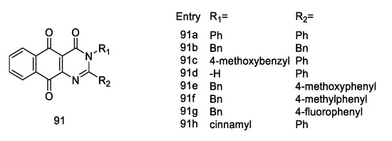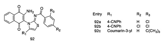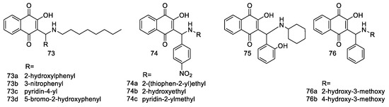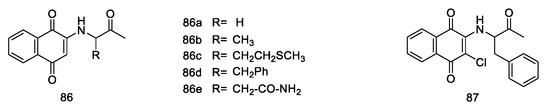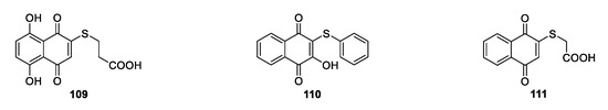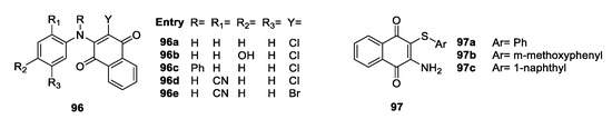 - Tandon, V.K.; Maurya, H.K.; Mishra, N.N.; Shukla, P.K. Design, Synthesis and biological evaluation of novel nitrogen and sulfur containing hetero-1,4-naphthoquinones as potent antifungal and antibacterial agents. Eur. J. Med. Chem. 2009, 44, 3130–3137. [Google Scholar] [CrossRef]