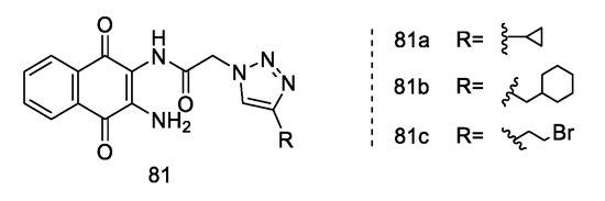 Khoshneviszadeh et al. [76] synthesized a novel series of aminonaphthoquinone compounds, distinctively integrating 1,2,3-triazole hybrids at the 2-position of the naphthoquinone ring. The primary aim was to evaluate the cytotoxic activity of these compounds against three human cancer cell lines: MCF-7 (breast cancer), HT-29 (colorectal cancer), and MOLT-4 (acute lymphoblastic leukemia).