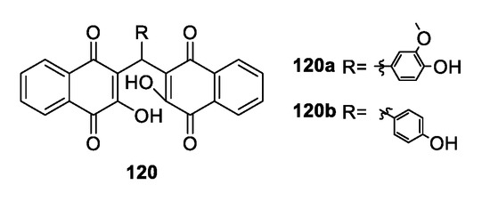 - Tisseh, Z.N.; Bazgir, A. An efficient, clean synthesis of 3,3′-(arylmethylene)bis(2-hydroxynaphthalene-1,4-dione) derivatives. Dye. Pigment. 2009, 83, 258–261. [Google Scholar] [CrossRef]