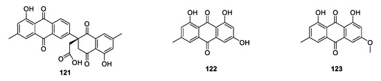 - Pang, X.; Zhao, J.Y.; Liu, N.; Chen, M.H.; Ma, B.P. Anthraquinone analogues with inhibitory activities against influenza a virus from Polygonatum odoratum. J. Asian Nat. Prod. Res. 2020, 23, 717–723. [Google Scholar] [CrossRef] [PubMed]