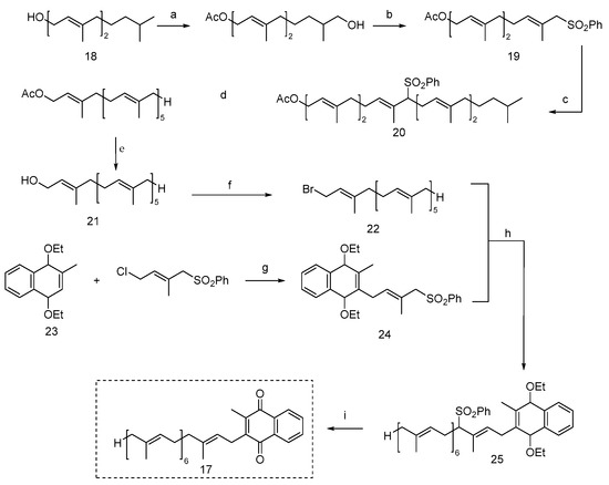 For the synthesis of vitamin MK-2 (13, Scheme 2), Snyder et al. [31] reported a method using 2-metal-3-methyl-1,4-dimethoxynaphthalene (14) and brominated alkanes, proving most effective for high-yield MK-2 synthesis up to 80% and 99% retention of E-configuration. Garcias [32] described a synthesis route for MK-4 (15), involving 2-bromo-3-methyl-1,4-dimethoxynaphthalene (16) and allyl aldehyde coupling using n-butyllithium to deliver corresponding alcohol, followed by Birch hydrogenolysis (BIHY) to retain the conformation of a desired intermediate and, finally, ceric ammonium nitrate (IV) oxidation to obtain vitamin MK-4.