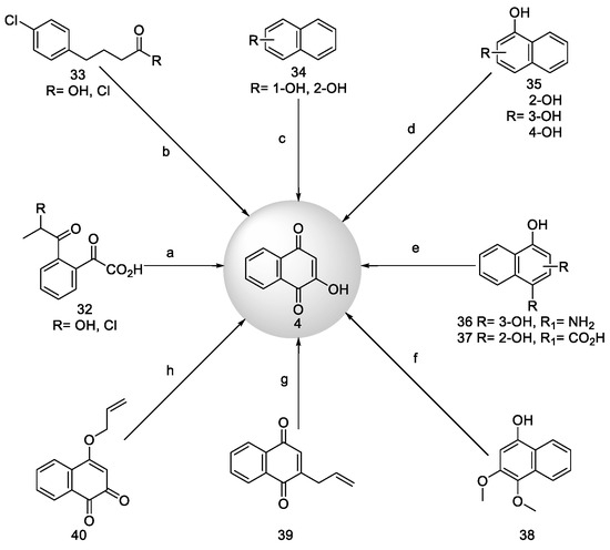 Fieser et al. [48] accomplished the synthesis of lawsone (4, Scheme 5) through the closure of the phenyl derivative’s ring (32) via a cyclization reaction. This reaction can occur under alkaline conditions in atmospheric air or catalyzed by p-nitrotoluene and copper sulfate. Inoue et al. [49] employed a multistep process to convert 4-chlorobutyryl compounds (33) into lawsone. Initially, naphthol (34, 35) was oxidized to 2-hydroxy-1,4-naphthoquinone using potassium superoxide (KO2) in a toluene solution of 18-crown-6 [50] or a tetrahydrofuran solution at −10 °C [51], delivering a 34% yield. Subsequently, 4-amino-1,3-naphthalenediphenol (36) underwent oxidation to deliver lawsone under HCl or NaOH conditions at 45 °C for an hour [52]. 3,4-dihydroxy-1-naphthoic acid (37) was hydrolyzed under alkaline KOH conditions in the presence of air to yield the target product [53]. Further oxidation of 3,4-dimethoxy-1-naphthol (38) was carried out in aqueous NaOH and potassium ferricyanide to afford lawsone (65% yield) and a dimer product [54]. Subsequently, 2-allyl-1,4-naphthoquinone (39) underwent oxidation using KOH and H2O2, yielding a lawsone. Finally, the hydrolysis of 4-allyloxy-1,2-naphthalenedione (40) under alkaline conditions resulted in the formation of lawsone and allyl alcohol.