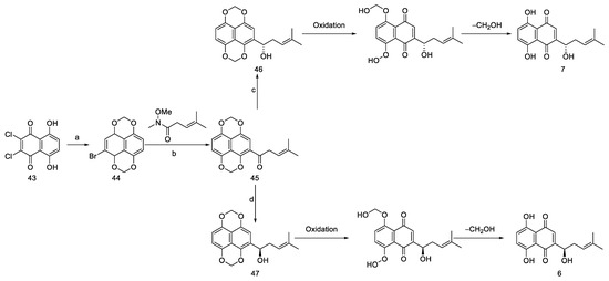 Red-root gromwell, belonging to the Comfrey family, encompasses two distinct species: Lithospermum erythrorhizon Sieb. & Zucc. and Arnebia euchroma (Royle) Johnst. It is predominantly found in regions spanning China, Korea, and Japan [55]. Within this botanical genus, shikonin (6, Scheme 6) and alkannin (7) emerge as a pair of enantiomeric isomers distinguished by their naphthazarin structure. Shikonin serves as the primary active constituent of Lithospermum erythrorhizon, whereas alkannin takes precedence in Arnebia euchroma. While conventional methods for obtaining shikonin have traditionally involved plant tissue extraction or cellular tissue cultivation, sustained research efforts have now made it feasible to achieve high enantiomeric excess (ee) values of shikonin, alkannin, and their derivatives through chemical synthesis [56,57].
