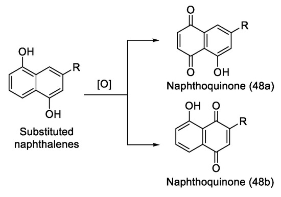 However, the presence of substituents on the naphthalene ring can lead to regioselectivity challenges during oxidation. As shown in Scheme 8, oxidation may occur at different positions, resulting in the formation of regioisomeric naphthoquinones (for example, 48a and 48b). These regioisomers differ in the position of the quinone groups rather than being enantiomers, as they do not exhibit chirality. Developing a novel oxidation strategy that improves regioselectivity could significantly enhance the efficiency of naphthoquinone synthesis.