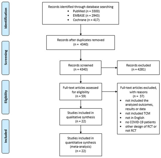 Inclusion criteria included only articles written in English of RCTs examining the efficacy of TCM only or in addition to COVID-19 treatment compared to placebo or standard care in the treatment of COVID-19. Articles should have been published before 5 April 2024 and included the following endpoints: time to recovery from fever, severity of dyspnea or breathlessness according to different scales, time to recovery for coughing, including dry and wet coughing, time to recovery for fatigue, changes in respiratory rate, length of hospitalization, hospital discharging rate, number of ICU admissions, number of cases requiring any supplemental oxygenation, number of deaths among COVID-19 patients, conversion rate of SARS-CoV-2 tests on particular days, and time to viral assay conversion. Exclusion criteria were as follows: articles not written in English and not containing the endpoints.