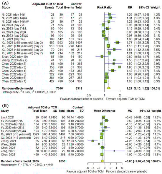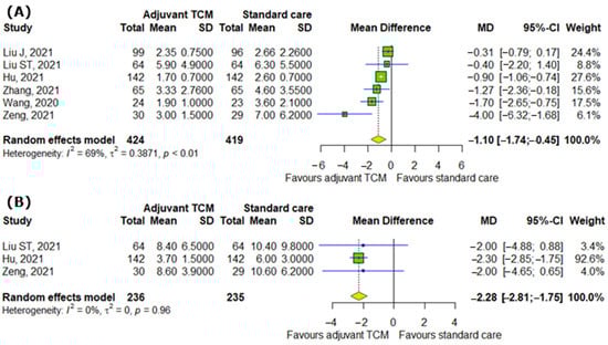 Interestingly, TCM positively affects the conversion rate of SARS-CoV-2 tests on particular days (RR = 1.21; 95% CI [1.10; 1.32]; p < 0.0001; I2 = 84%) (Figure 6A). Moreover, we detected differences between analyzed groups in time to viral assay conversion (MD = −0.85; 95% CI [−1.4; −0.3]; p = 0.0025; I2 = 77%) (Figure 6B).