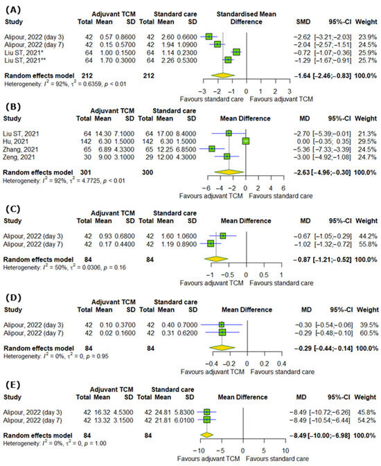 In the case of respiratory symptoms, there were also significant differences between interventional and control groups, for example, the severity of dyspnea or breathlessness according to different scales (SMD = −1.64; 95% CI [−2.46; −0.83]; p < 0.0001; I2 = 92%); time to recovery for coughing (MD = −2.63; 95% CI [−4.96; −0.3]; p = 0.0272; I2 = 92%), including dry (MD = −0.87; 95% CI [−1.21; −0.52]; p < 0.0001; I2 = 50%) and wet coughing (MD = −0.29; 95% CI [−0.44; −0.14]; p = 0.0001; I2 = 0%); and changes in respiratory rate (MD = −8.49; 95% CI [−10.0; −6.98]; p < 0.0001; I2 = 0%), as represented in Figure 3A–E.