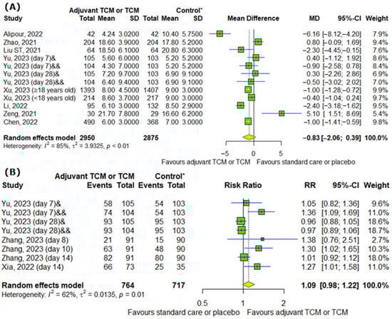 In comparison to standard COVID-19 treatment, the addition of traditional Chinese medicine to standard COVID-19 treatment affects systemic symptoms of COVID-19 by reducing (A) time to recovery from fever and (B) time to recovery from fatigue [8,9,13,16,17,25].